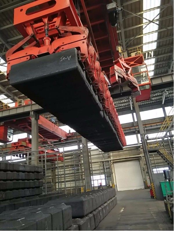 本产品通过自动夹钳,每次可夹取21块阳极碳块,最高可堆成8层。桥架下面装有工字钢,工字钢上装有5t电动葫芦,该葫芦沿工字钢运行,可通过单块自动碳块夹钳夹取碳块,还可在车间吊运零星杂物。运行和起升全部采用变频调速,全部操作均可在操纵室内完成。采用机械重力式自动夹取代替气动方式夹取碳块,为制造厂和用户大大节约了成本。