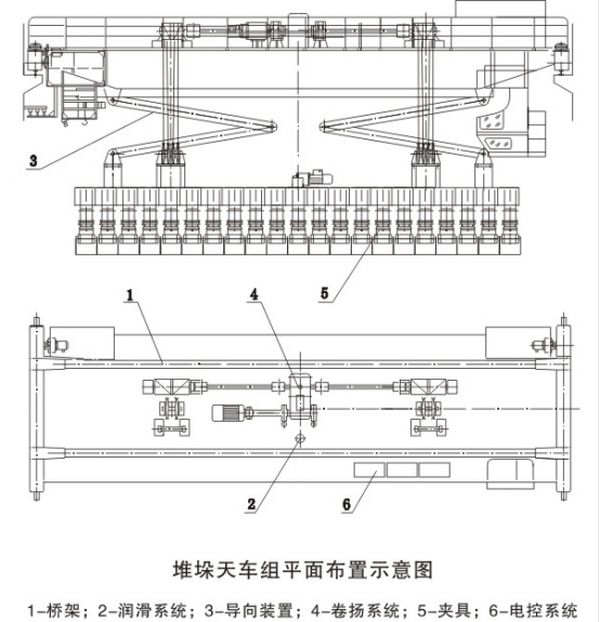 碳素堆垛起重机(又称碳素堆垛天车、、炭块堆垛机)全自控多用途碳块堆垛机组是大型预焙烧阳极碳块仓库内的关键设备,可夹放生、熟阳极碳块,通过链式输送机将碳块搬运到指定地点。